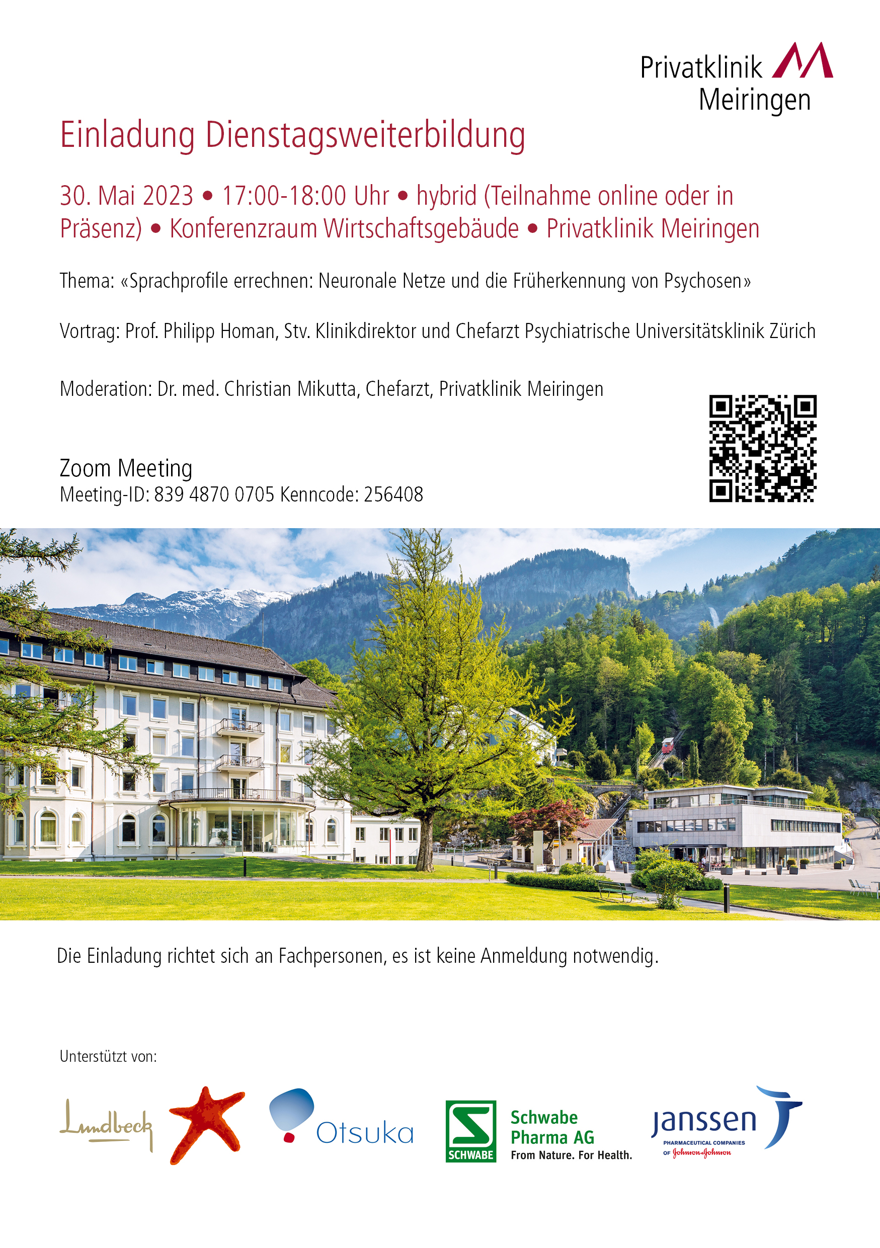 Konferenzraum Wirtschaftsgebäude Privatklinik Meiringen (Teilnahme auch per Zoom möglich)